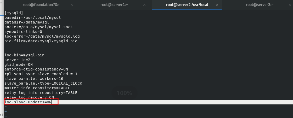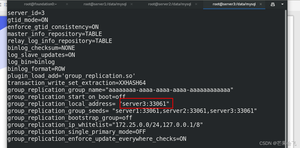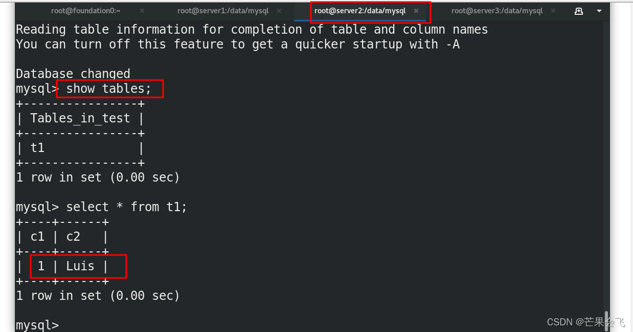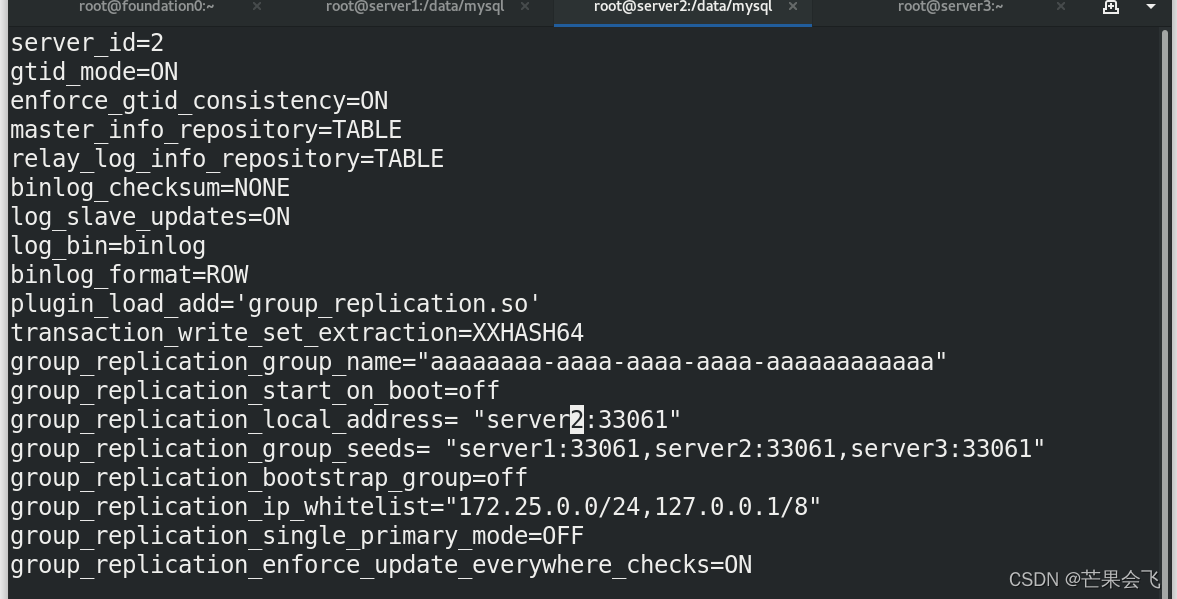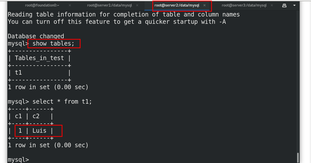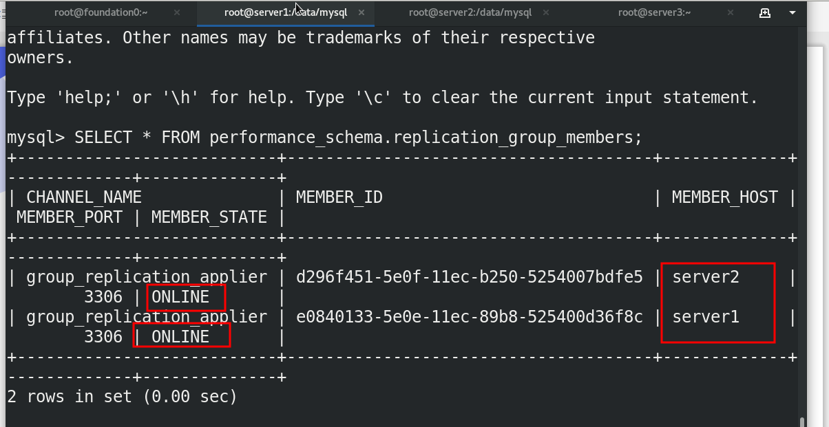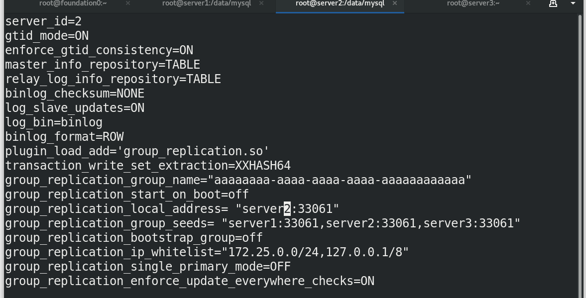 server2、server3 。在server2和3中查看刚才server1的消息已经同步过来了