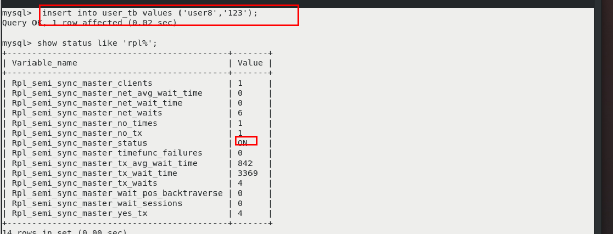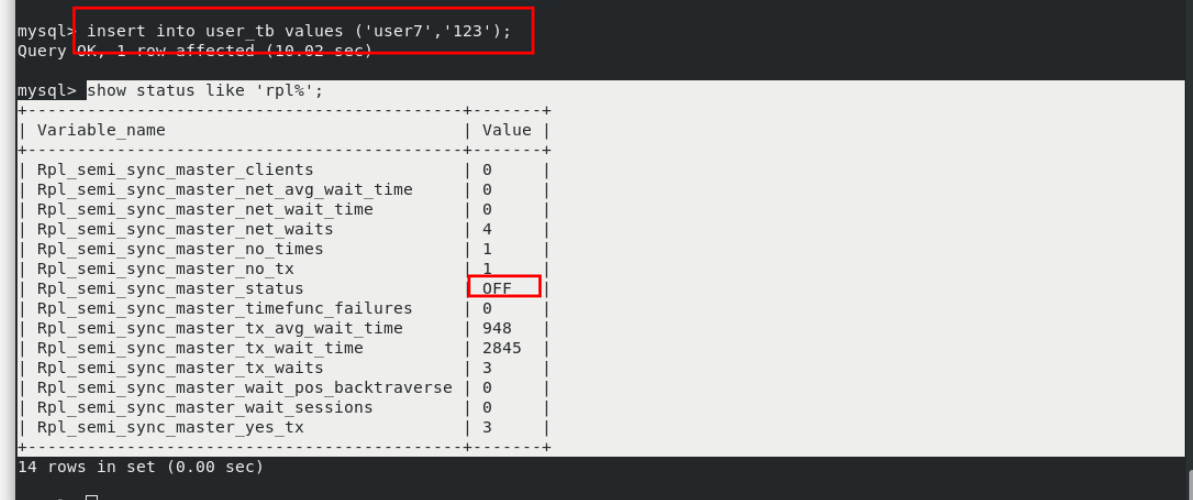 > insert into user_tb values ('user10','123');#过30秒后2和3都会同步到刚才在westos数据库中建立的user_tb表里的信息,因为上一个实验做了30秒的延迟。