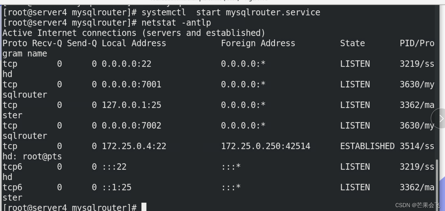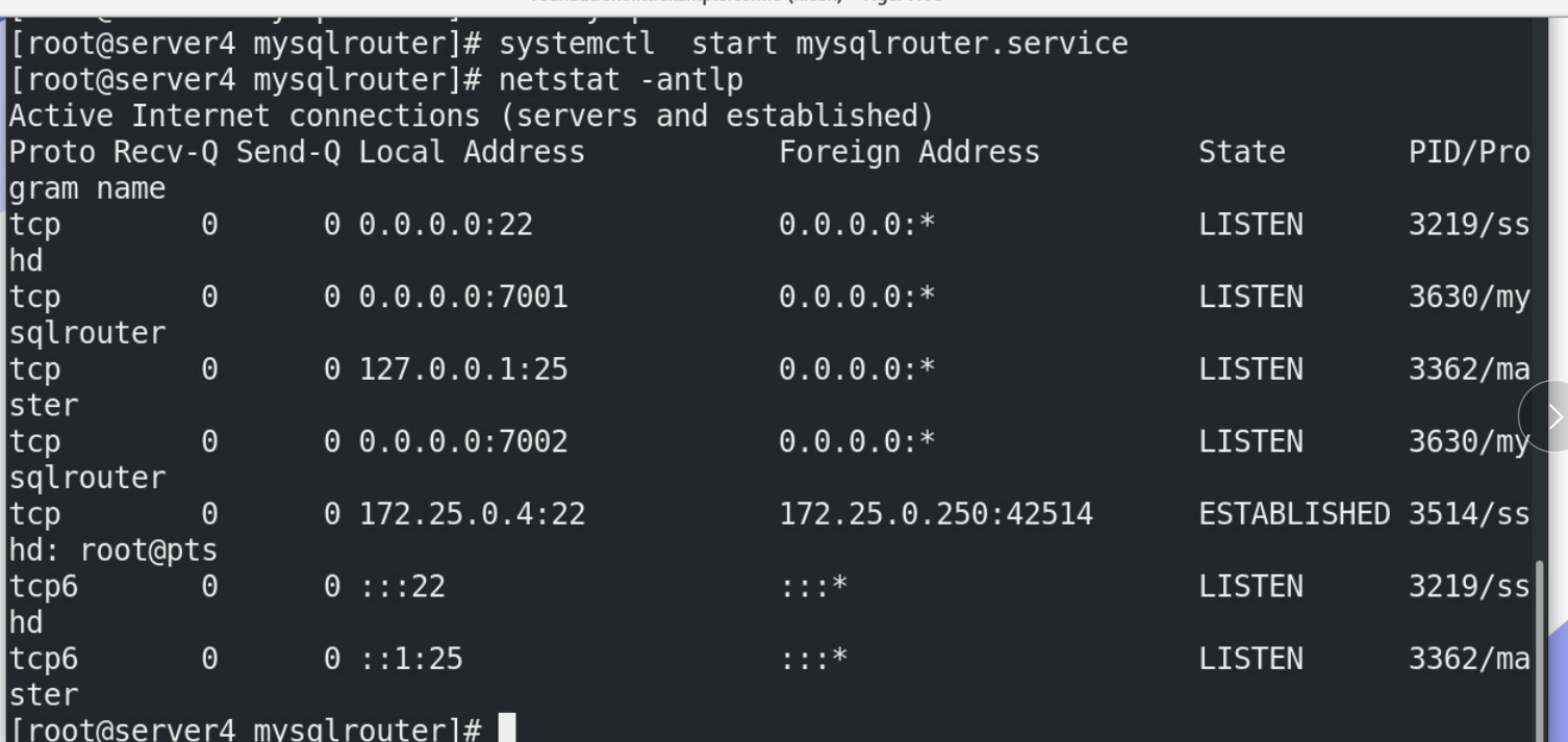 说明:用真机执行mysql -h 172.25.11.4 -P 7001 -u dmq -p test。在server2或server3中用lsof -i :3306命令查看,会轮流在2或3上,实现负载均衡