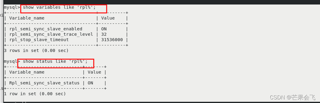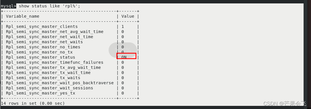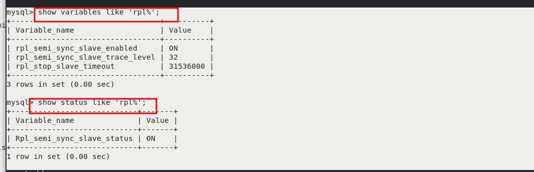 /etc/init.d/mysqld restart #执行数据库重启命令后,再看'rpl%'的status会直接时ON的状态,但不执行的话需要关闭在开启之后'rpl%'的status才会是ON状态