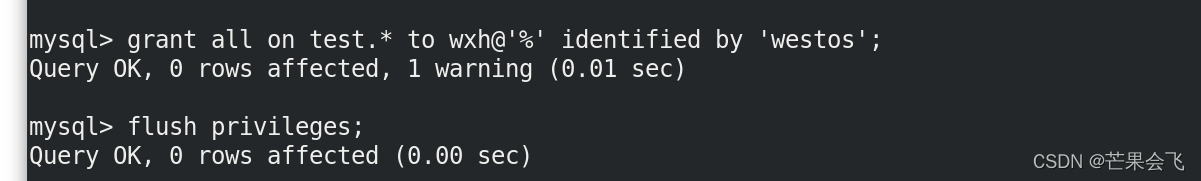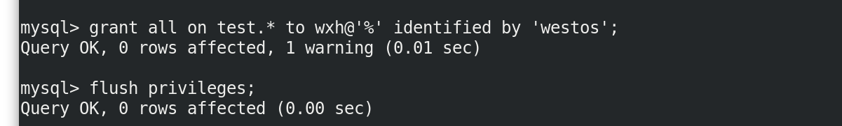 --> grant all on test.* to dmq@'%' identified by 'westos';