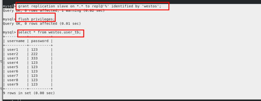--> grant replication slave on *.* to repl@'%' identified by 'westos';
