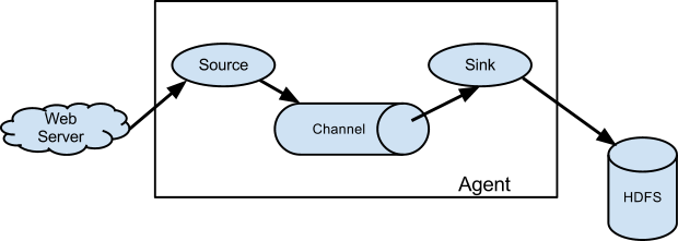 Flume启动一个Agent,通过Source从外部数据源(如Web服务器)对数据消息(Event)进行采集,然后放在Channel当中临时存储,由Sink从Channel里面进行消费消息,写入到HDFS里面进行持久化存储。