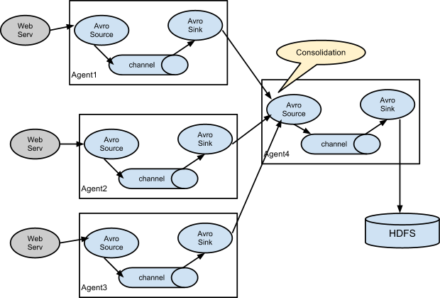 有三个WebServer服务器分别产生数据,针对这三台服务器分别启动三个Agent,Agent1,Agent2,Agent3对应三个WebServer,每个Agent负责收集对应服务器产生的数据消息(Event),收集完之后,这三个Agent再Sink阶段,都把数据发送到了Agent4,Agent4的作用是负责收集其他三个Agent输出的数据,并把收集到的所有数据写入到HDFS当中。