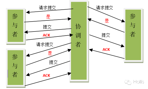 4)协调者节点受到所有参与者节点反馈的"完成"消息后,完成事务。