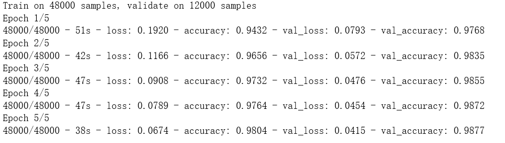 train_history = model.fit(x=x_train4D_normalize,y=y_trainOneHot,validation_split=0.2,epochs=5,batch_size=300,verbose=2)