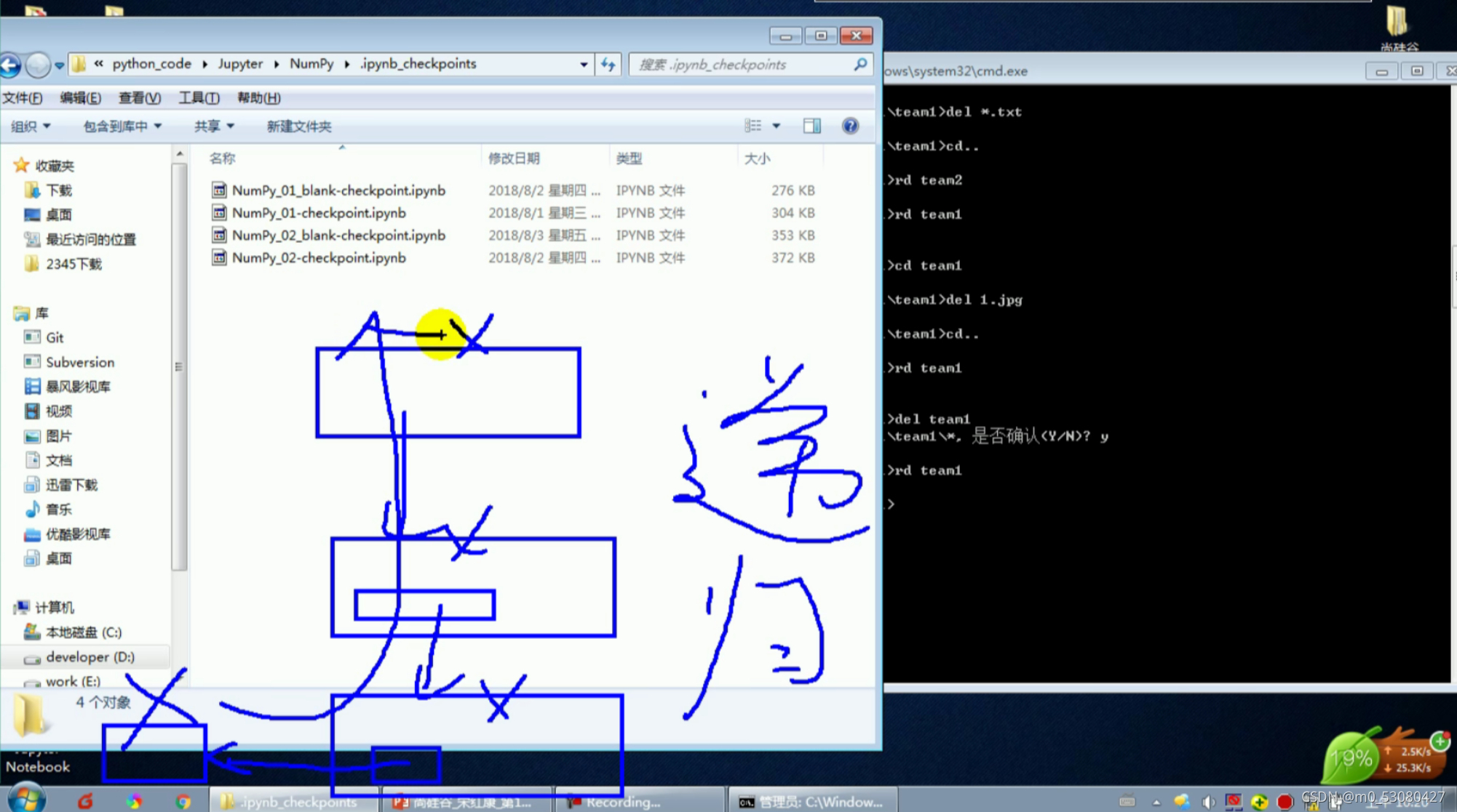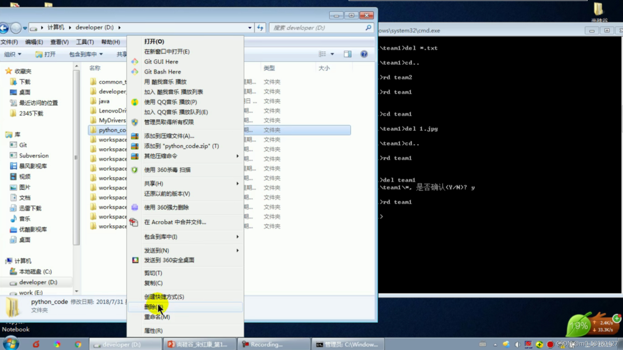 删除文件目录不能用del,得用rd,全称是remove directory。