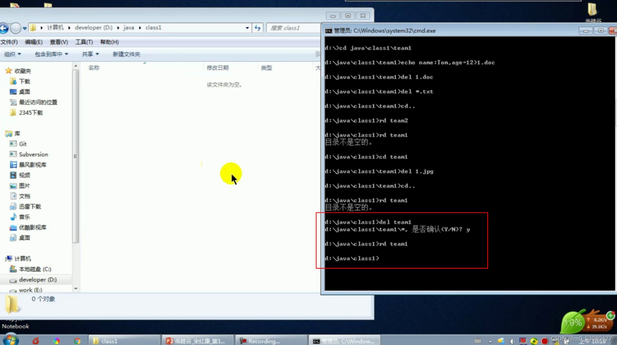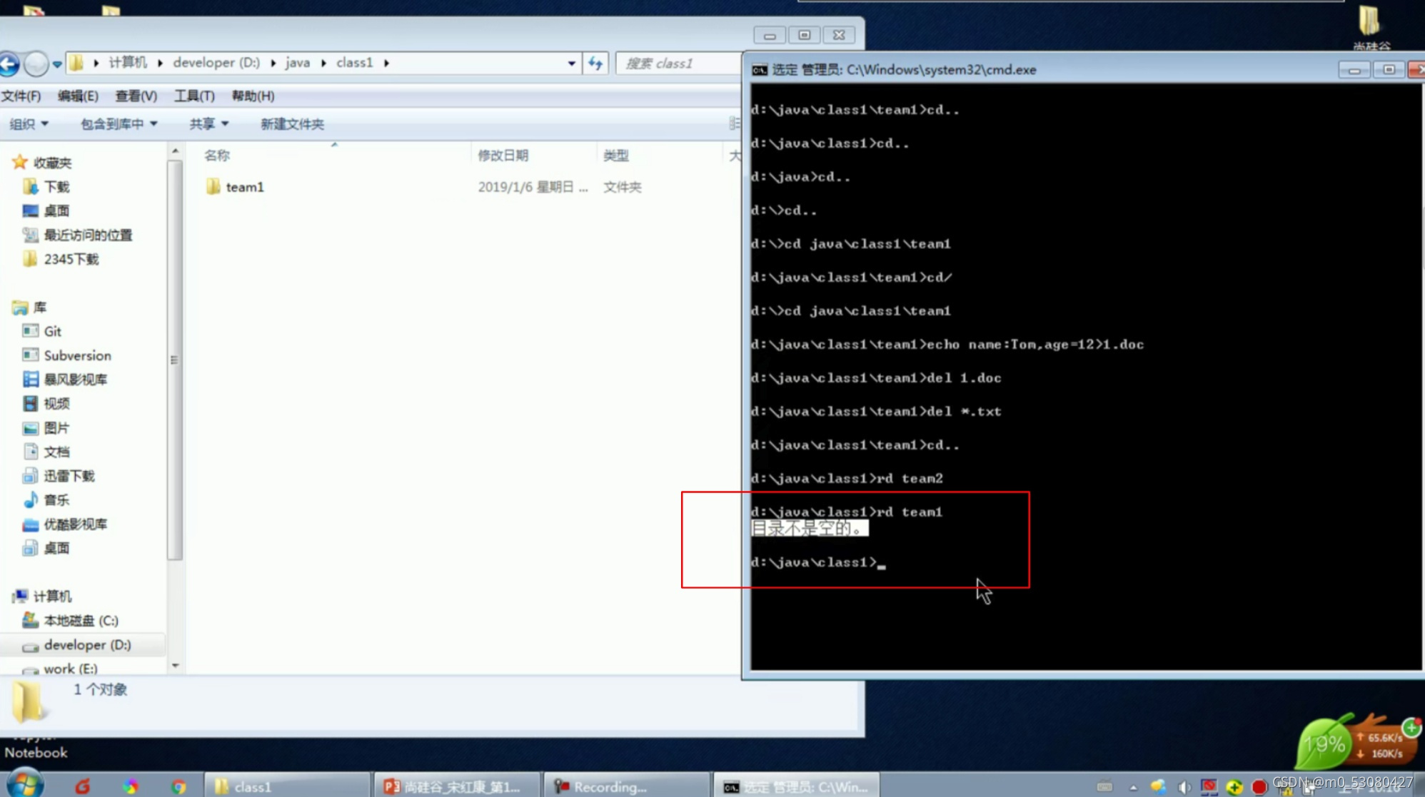 操作失败,提示“目录不是空的”。说明rd删除目录只能是删除空目录,team1文件夹内有文件所以删除失败。