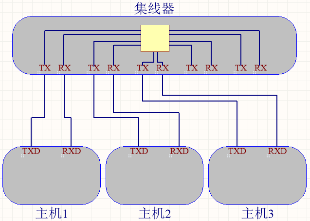 4、由于集线器工作在物理层,它不会理会传输的数据内容,也就是网络数据里面的MAC地址或者IP地址和它是没有关系的,它不会把数据拆包并且分析,只会转发数据。集线器的内部没有MAC地址表,所以就无法进行制定端口的数据转发,为了避免数据的冲撞,它采用CSMA/CD(即带冲突检测的载波监听多路访问技术)介质访问控制机制,所以同一个时间只能有两个端口是互联的,其它的端口都处于载波侦听状态,无法使用网络带宽。其实简单的说集线器的内部原理就是将所有端口的之间都连在一起,下图是简单的示意图:(为了绘图简单使用单线代表差分线)