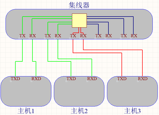 示意图中有一个集线器和三台主机,主机通过直通网线或者交叉网线连入到集线器(假设集线器有MDIX功能),当主机1发送一帧数据给主机2时,集线器会在内部形成一条绿色通道: