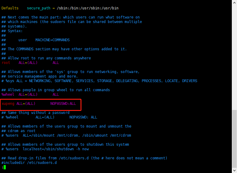 xupeng ALL=(ALL) NOPASSWD:ALL