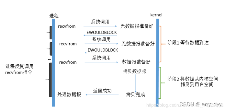 当用户进程调用recvfrom(system call)时,系统不会阻塞用户进程,而是立刻返回一个ewouldblock错误,从用户进程角度讲 ,并不需要等待,而是马上就得到了一个结果。用户进程判断标志是ewouldblock时,就知道数据还没准备好,于是它就可以去做其他的事了。但是需要它主动地去再次发送recvfrom,一旦内核中的数据准备好了,那么内核进程马上就将数据拷贝到了用户内存,然后返回。