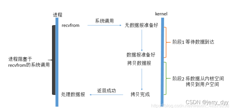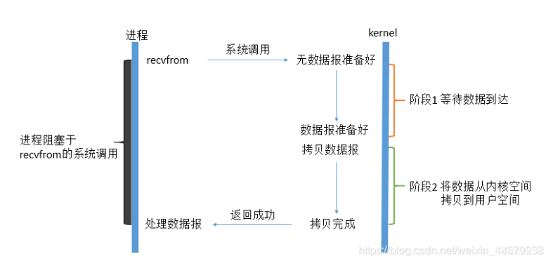 当用户进程调用了recvfrom (system call),之后用户进程就一直阻塞,等待数据准备好,也就是等待数据被copy到用户空间。而内核负责把IO设备的数据填入其buffer,然后再把buffer数据copy到用户空间,然后内核返回结果,用户进程才解除block的状态,重新运行起来。
