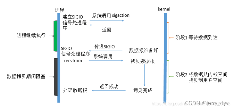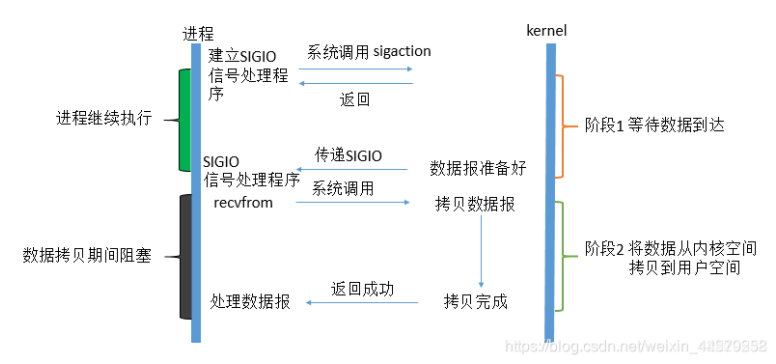 很明显可以看出用户进程不是阻塞的。首先用户进程建立SIGIO信号处理程序,并通过系统调用sigaction执行一个信号处理函数,这时用户进程便可以做其他的事了,一旦数据准备好,系统便为该进程生成一个SIGIO信号,去通知它数据已经准备好了,于是用户进程便调用recvfrom把数据从内核拷贝出来,并返回结果。