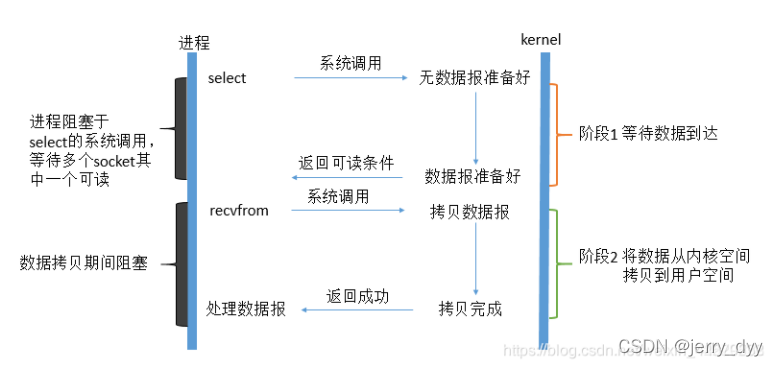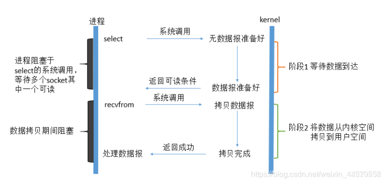 IO multiplexing这个词可能有点陌生,但是如果我说select,epoll,大概就都能明白了。有些地方也称这种IO方式为event driven IO。我们都知道,select/epoll的好处就在于单个process就可以同时处理多个网络连接的IO。它的基本原理就是select/epoll这个function会不断的轮询所负责的所有socket,当某个socket有数据到达了,就通知用户进程。它的流程如图: