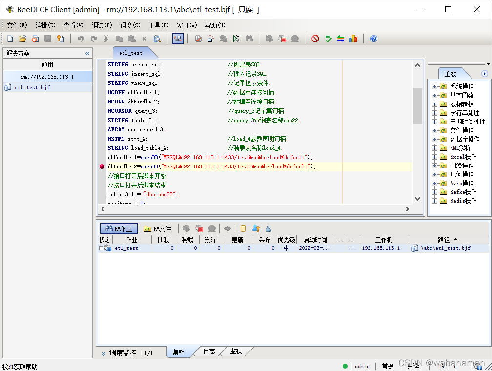 双击BeeDI客户端RM作业视图的任务将其打开,然后切换到脚本视图并增加调试断点执行任务。