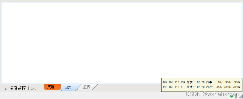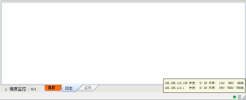 登录资源管理器后,将鼠标移到窗口右下角集群状态图标悬停,可以查看集群中作业服务器信息,包含服务器地址,运行作业数,内存使用情况等。