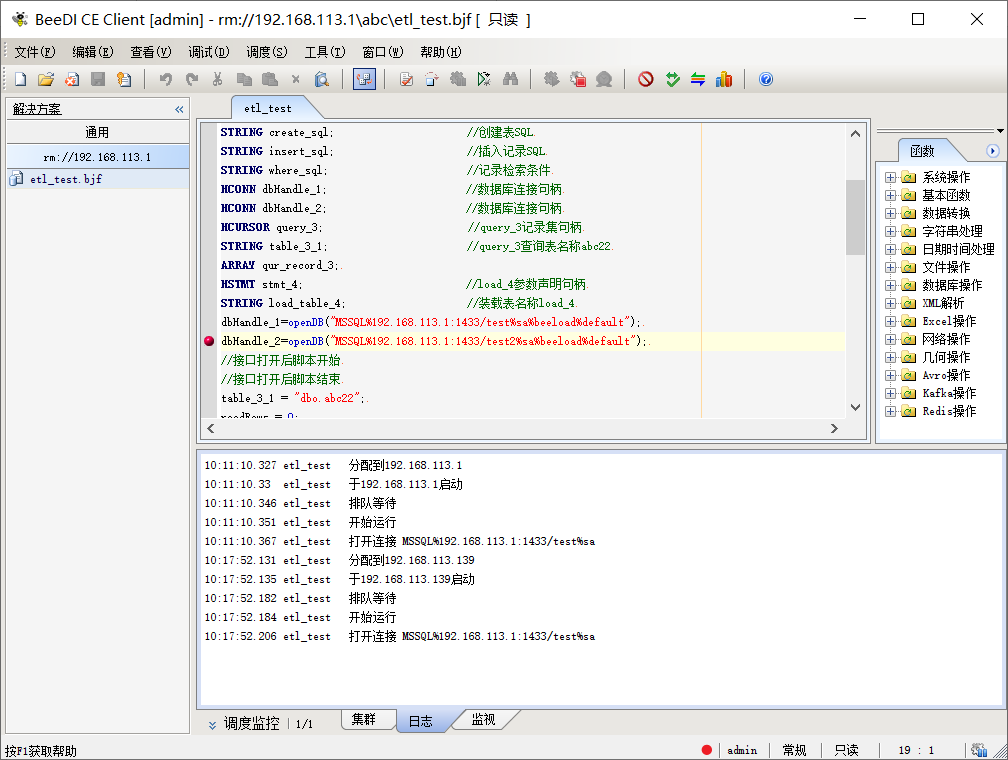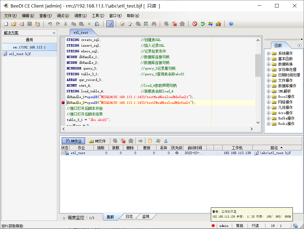 BeeDI支持集群环境中的任务调试,可设置调试断点,查看脚本变量值。