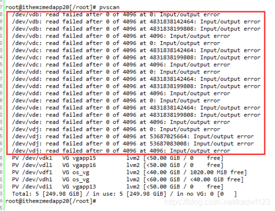 同时,在app20该主机上使用fdisk -l也无法看到对应的/vdb/vdc/vdd/vde/vdj五块盘。