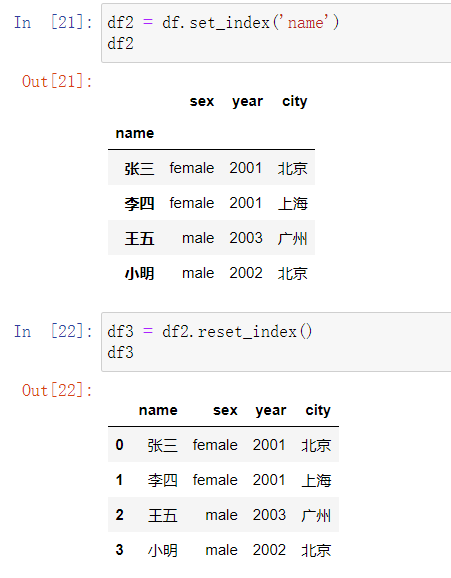 在DataFrame数据中,如果不希望使用默认行索引的话,可以在创建的时候通过index参数来 设置行索引。有时候我们希望将列数据作为索引,这时可以通过set_index方法来实现如下图