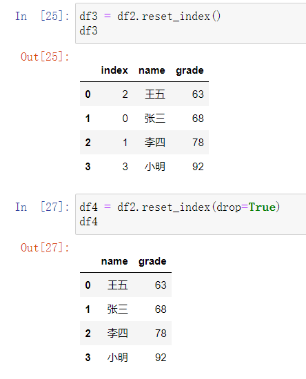 这里获取成绩倒数两位同学的数据的话,需要记住其单独的索引。但当数据量大的时候,想查看多维排序过后的数据时,这种做法是很不方便的。我们可以通过恢复索引,对数据进行排序。如下图,原索引可通过drop参数进行删除。