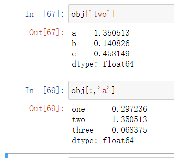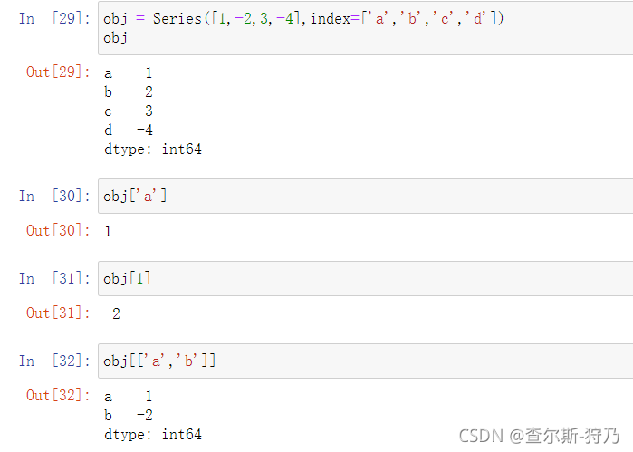 Series数据的选取较为简单,使用方法类似于Python的列表,这里不仅可以通过0到N-1(N是数据长度)来进行索引,同时也可以通过设置好的索引标签来进行索引。如下图