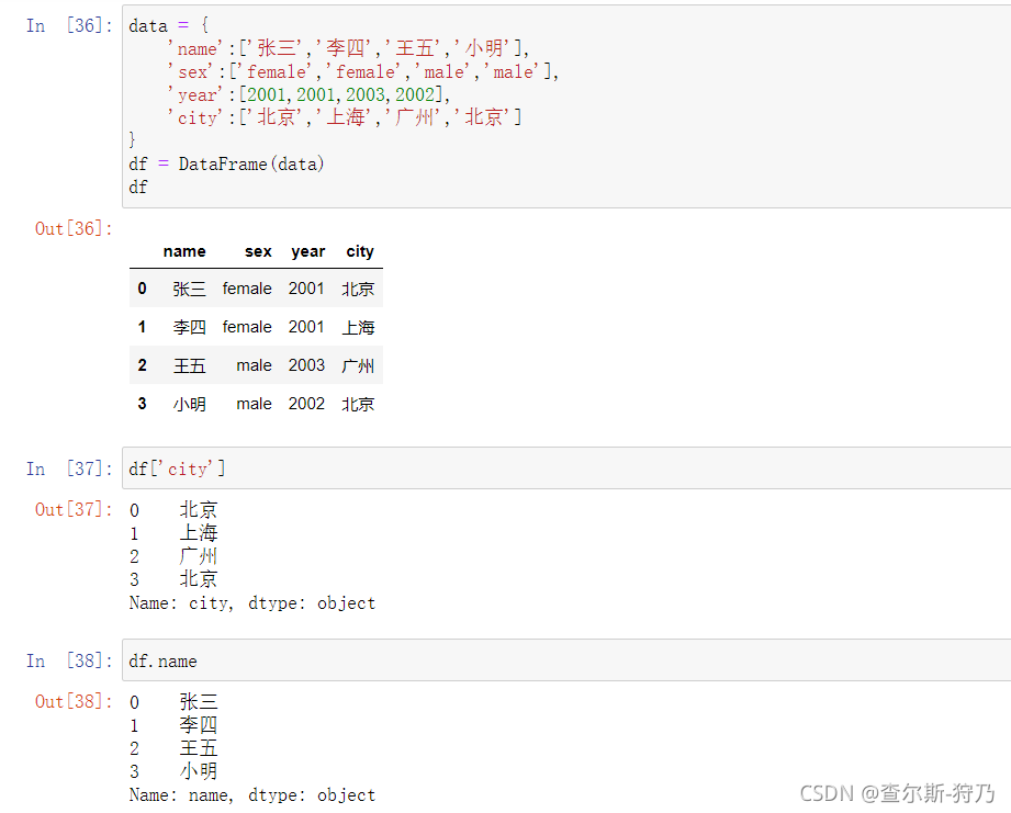 Series数据中的索引和值一一对应,类似于Python字典数据,所以也可以通过字典数据来创建Series,如图