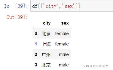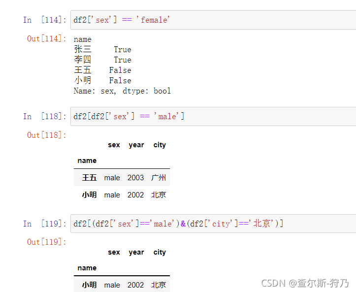 以df2为例子,筛选出性别为famale的数据,这时就需要用布尔选择来完成。与数组布尔索引类似,既可以使用布尔选择,那么同样也适用于不等号(!=)等逻辑运算符