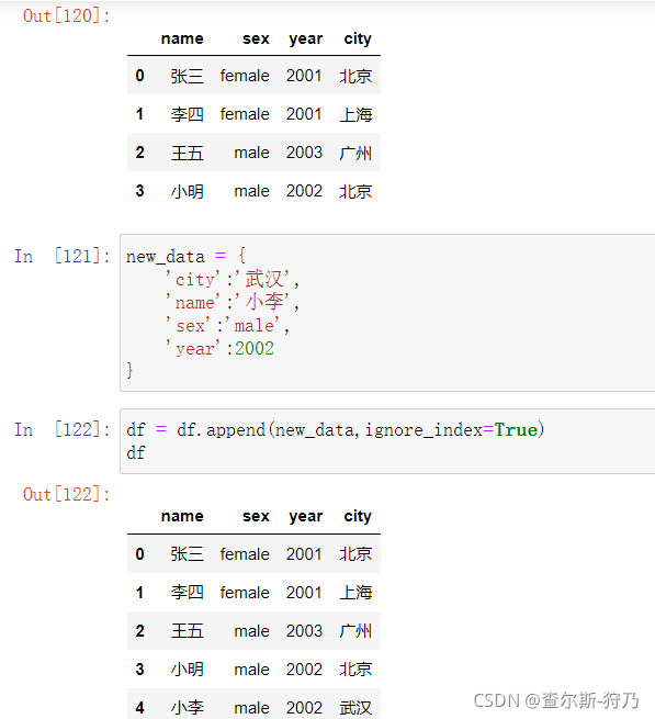 以df数据为例,该班级转来一个新生,需要在原有数据的基础上增加一行数据。可以通过append函数传入字典结构数据即可,如下图