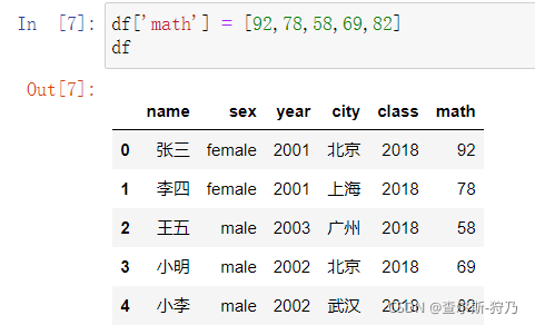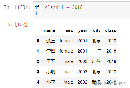 这些学生都是2018级的,这里我们新建一列用于存放该信息。为一个不存在的列赋值,即可创建一个新列。