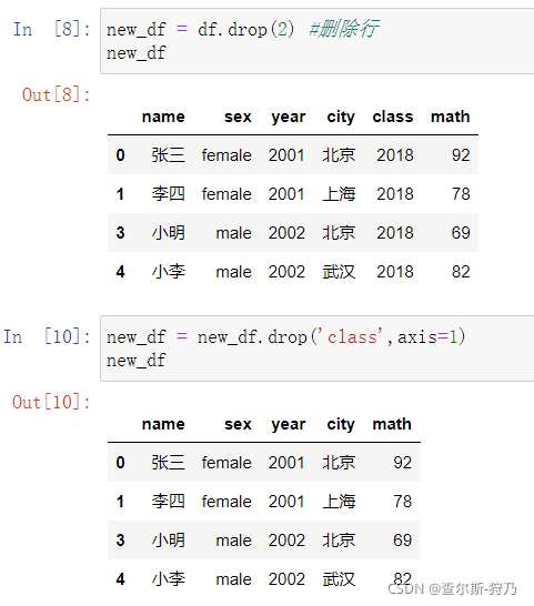 如果王五同学转学列,class字段没有用列,就需要删除其信息。通过drop方法可以删除指定轴上的信息。