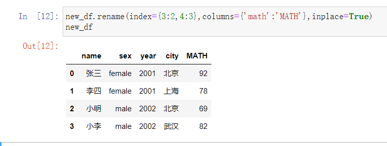 这里的改指的是行和列标签的修改,通过rename函数,可完成由于某些原因导致的标签录入错误的问题