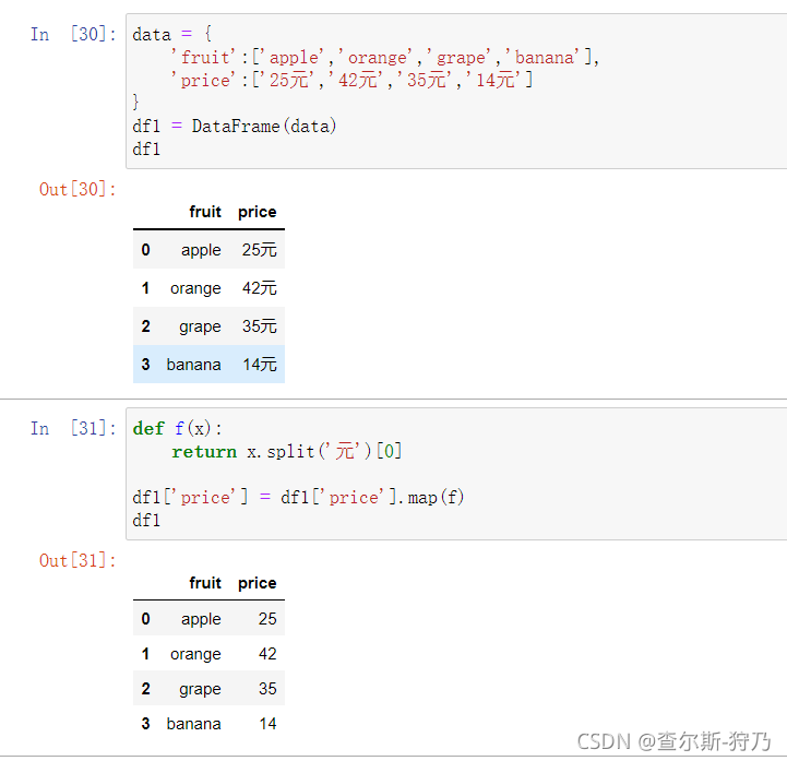 如图,需要把price列的“元”字去掉,这时就需要用到map函数,如图