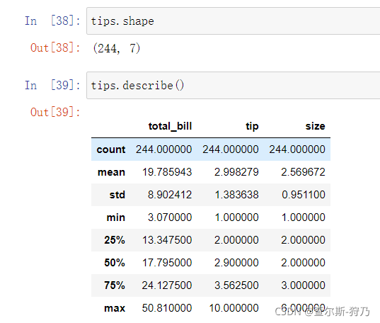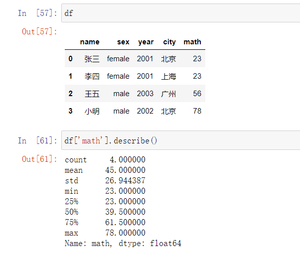 describe方法可对每个数值型列进行统计,经常用于对数据的初步观察时使用,如图