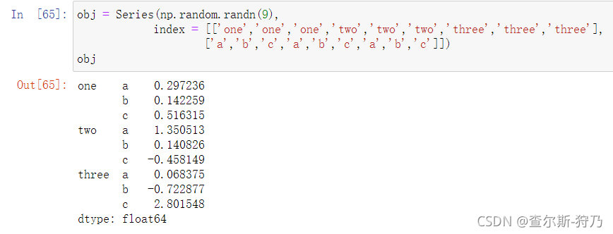 简单地说,层次化索引就是轴上有多个级别索引,如下图,为创建一个层次化索引的Series对象