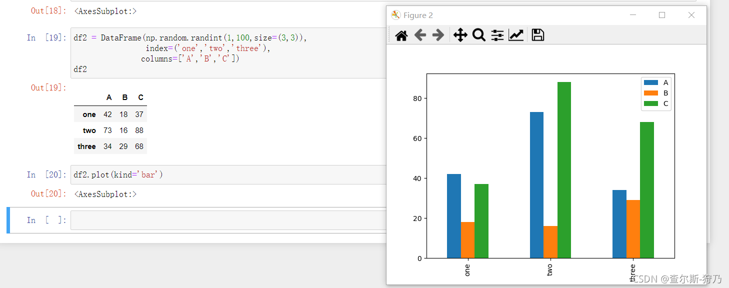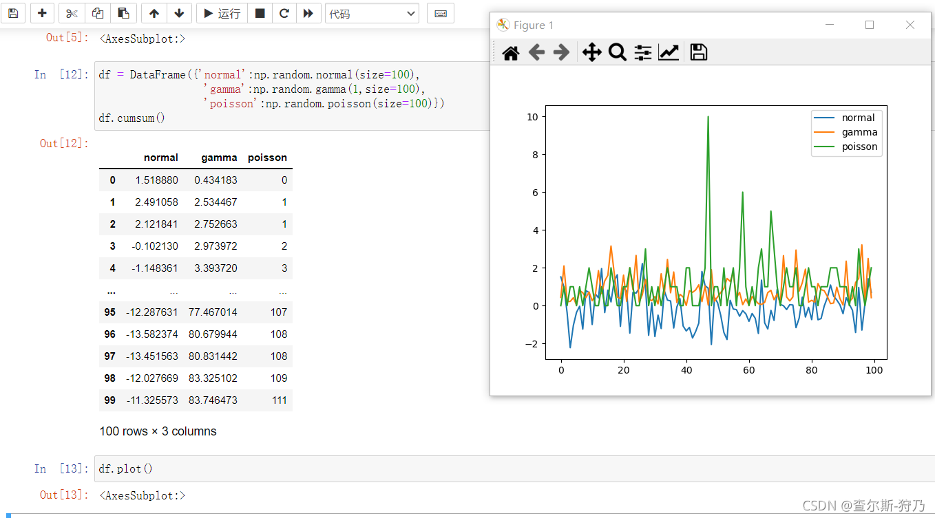 通过DataFrame数据的plot方法可以为各列绘制一条线,并会给其创建好图例。首先创建DataFrame数据,如下图
