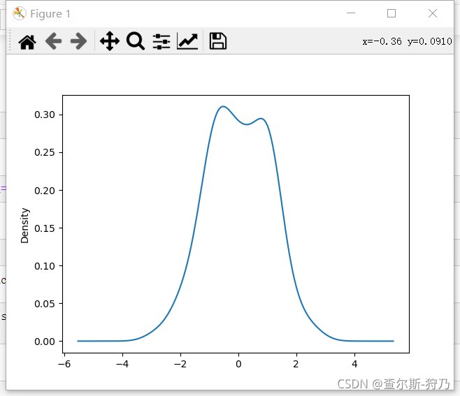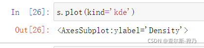 核密度估计(Kernel Density E身体马特,KDE)是对真实密度的估计,其过程是将数据的分布近似为一组核(如正态分布)。通过plot函数的kind=‘kde’可进行绘制,如图