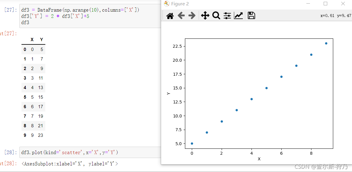 散点图主要用来表现数据之间的规律。例如,身高和体重之间的规律。下面创建一个DataFrame数据,然后绘制散点图