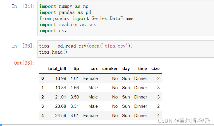 小费数据来源与Python第三方库Seaborn(用于绘图)中自带的数据,加载该数据集(需要先把数据集下载到本地)