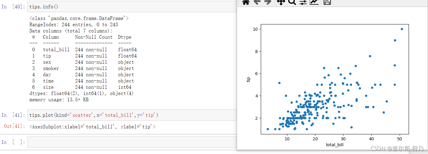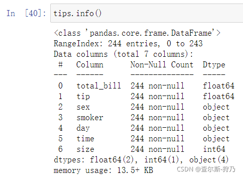 通过结果可以看出,总共有244条数据,通过统计暂时看不出是否有缺失值。通过打印数据的info信息可以看出每列数据的类型和缺失值,本例中的小费数据集没有任何缺失值如下图