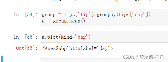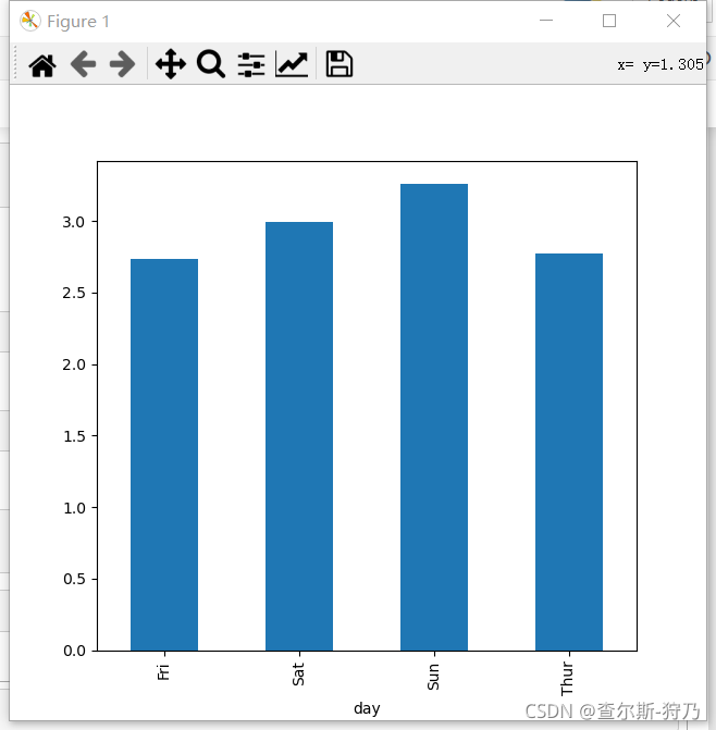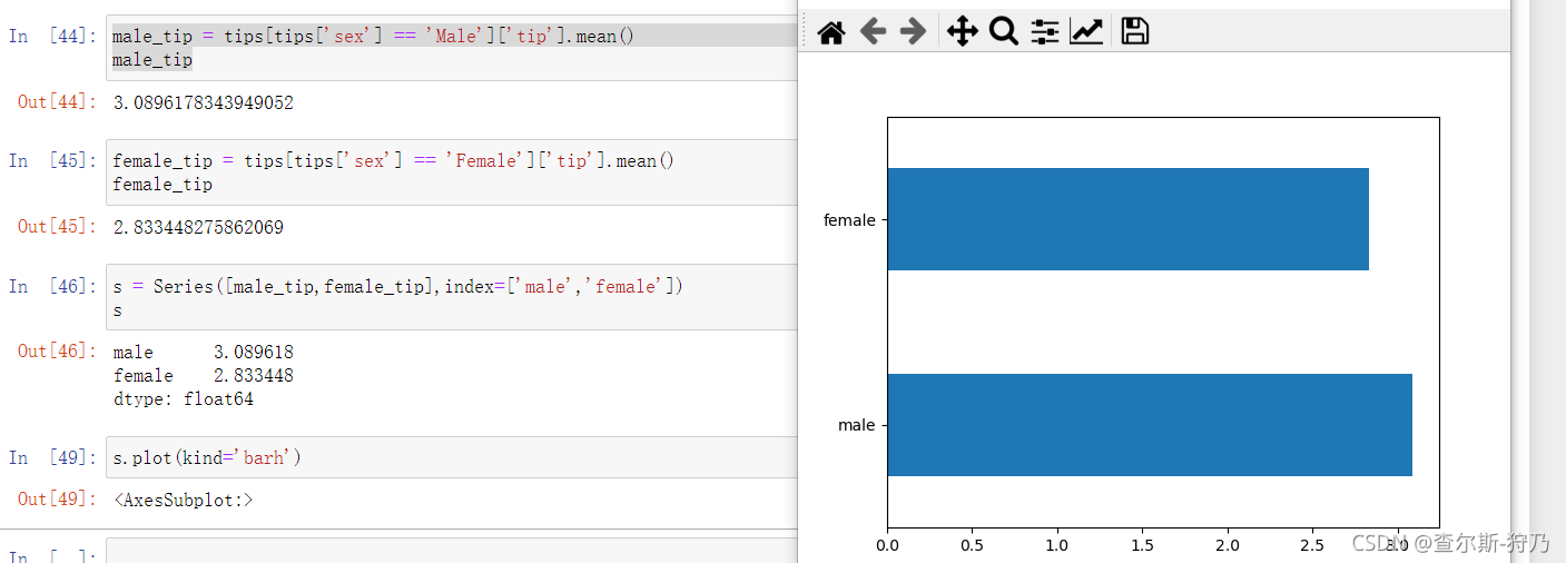我们来看下性别不一样是否会影响小费的金额。这里使用柱状图,通过布尔选择男女,对消费数据进行平均后绘制柱状图,具体操作如下