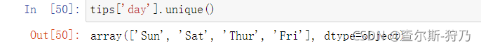其他字段与小费的关系也是类似的方法。例如,日期与小费的关系,由于观察数据时只看到前5行数据,,通过unique函数看下日期的唯一值有哪些