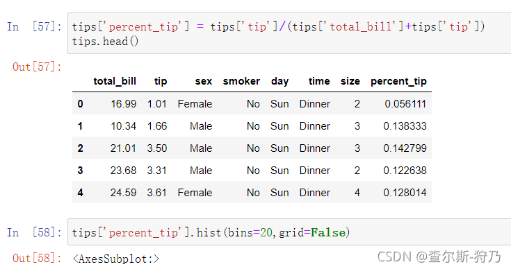 最后我们来 分析以下小费百分比的分布状况,这里小费总金额为小费的金额和聚餐所花费的金额,通过DataFrame算数运算,新建一列,用于存储小费百分比
