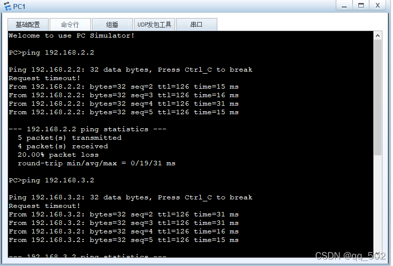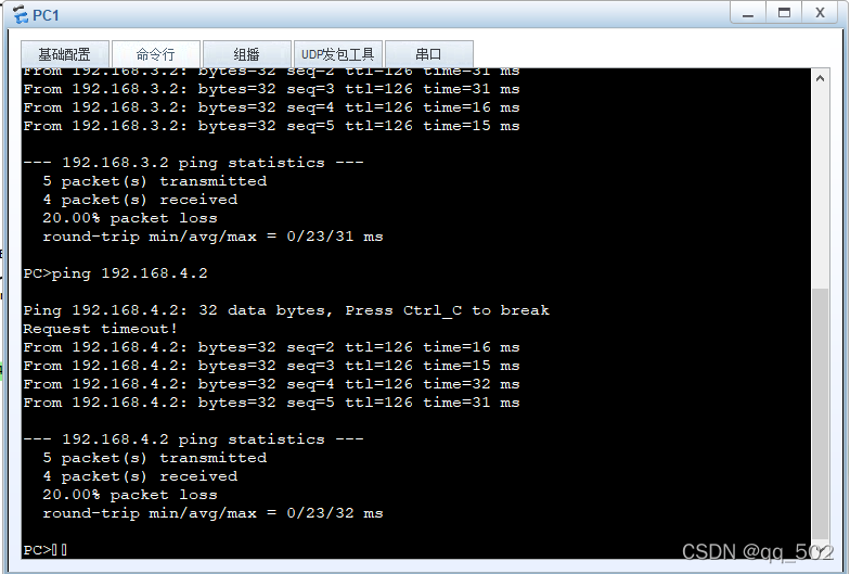 Reply from 45.1.1.1: bytes=56 Sequence=4 ttl=255 time=20 ms