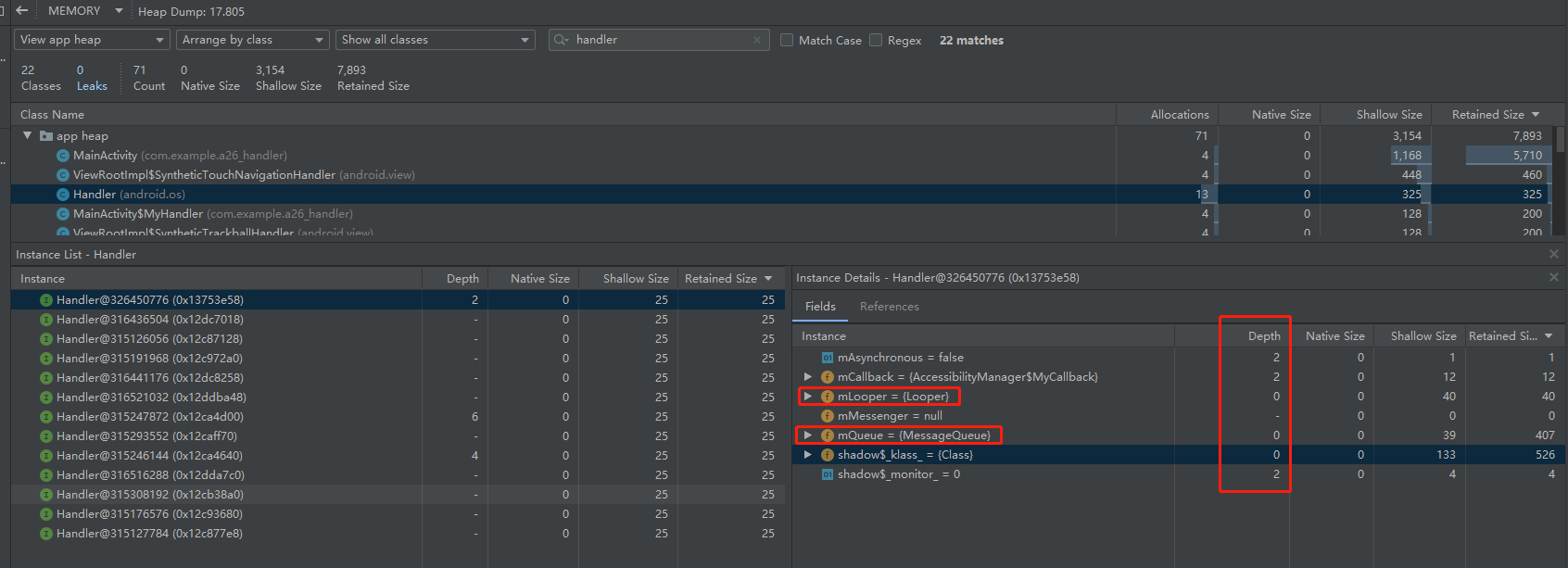 上图是一张通过profile抓取的memory的截图。官方文档对Depth进行了这样的解释,从任意GC根到选定实例的最短跳数。那么depth = 0,就代表着它为GCRoot,也就是说mlooper,mQueue都是GCRoot,而Handler又持有它们的引用,所以Handler不光是和GCRoot之间有强引用连接,而且还是多个GCRoot。