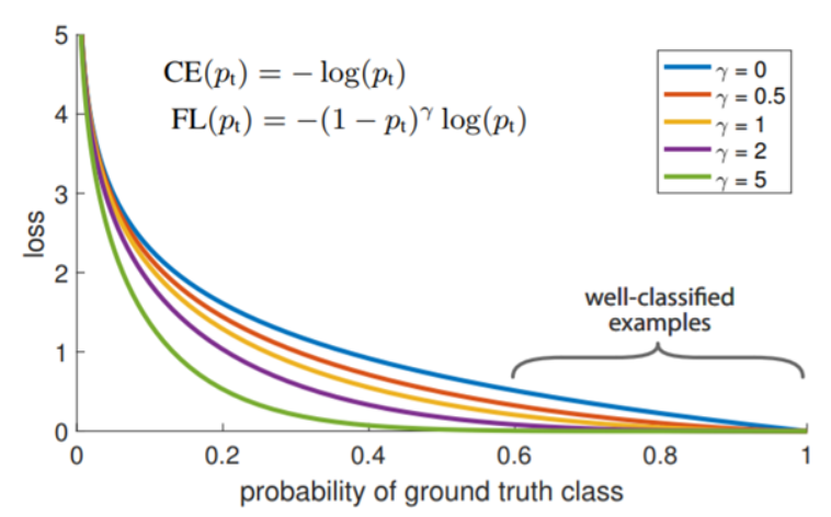 类别极度不平衡在训练中,易分类负样本占了损失函数大部分,支配了梯度,会压垮交叉熵损失函数。平衡交叉熵采用平衡正负样本的重要性,但是没有区分难易样本。Focal Loss在平衡交叉熵损失函数的基础上,增加一个调节因子降低易分类样本权重,聚焦于困难样本的训练,其定义如下:
