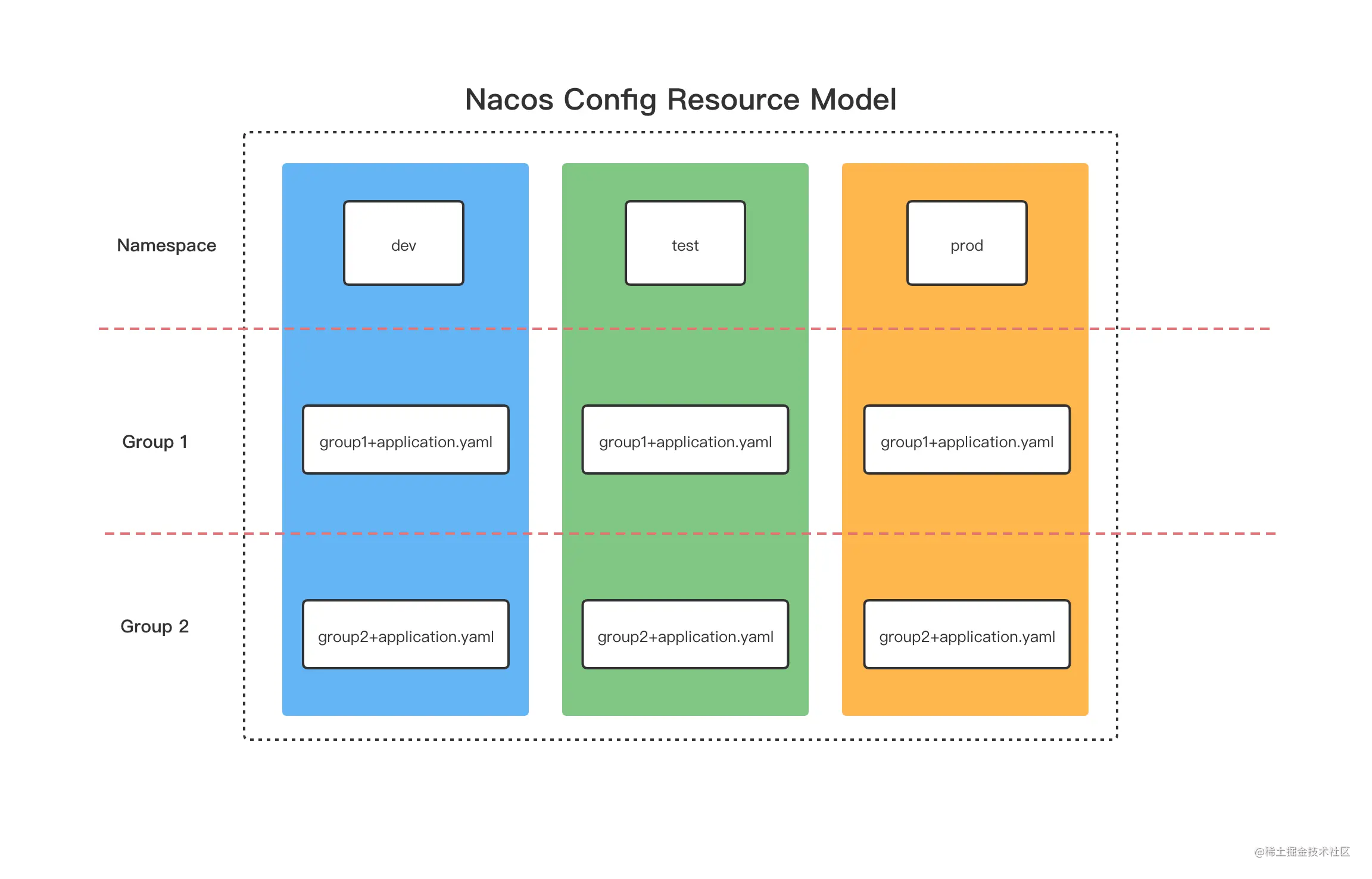 - 配置组(Group):Nacos中的一组配置集,是配置的维度之一,默认为DEFAULT_GROUP,常见的使用场景为不同的应用或组件使用了相同的配置项。