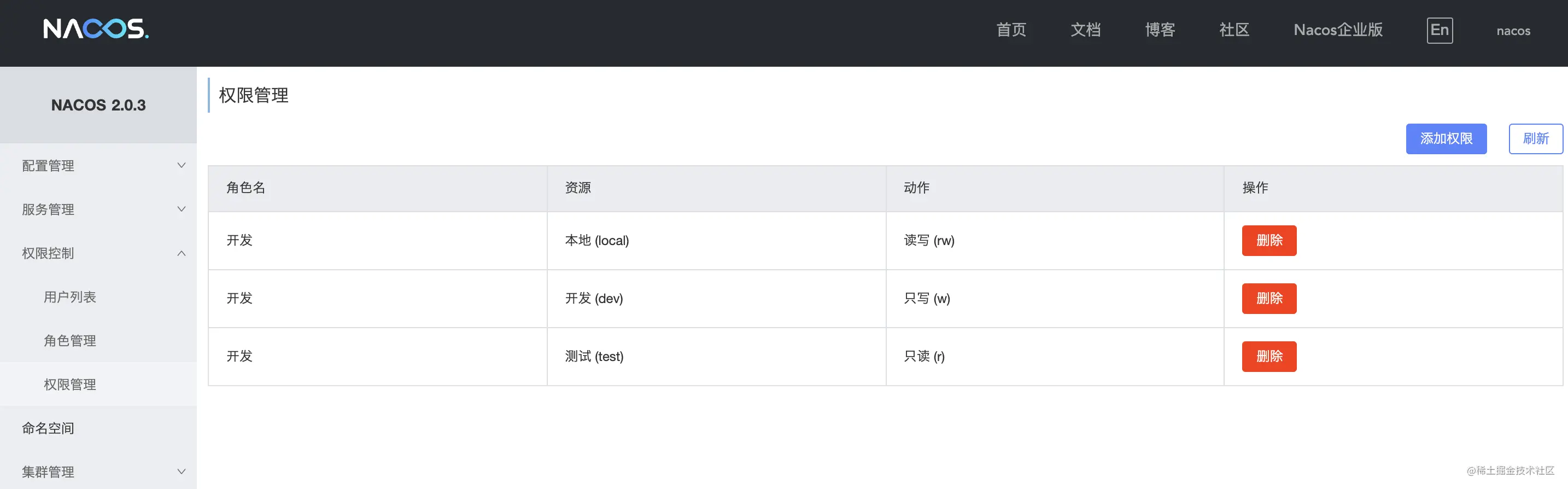 Nacos在权限设计上采用RBAC体系,授权的资源知道命名空间,粒度很大,功能也相对较弱。