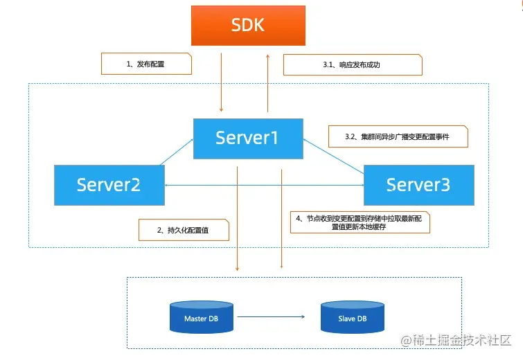 - 有DB,核心是保证Server与DB之前的数据一致性。Server之间完全对等的,数据写任何一个Server,优先持久化,然后异步通知其他节点到数据库中拉取最新配置值,并且通知写入成功。