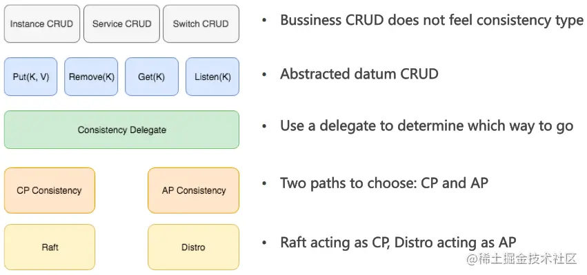 Nacos支持AP和CP两种并存的一致性协议,实现上,一个是基于简化的Raft的CP一致性,一个是基于自研协议Distro(Gossip改进)的AP一致性。